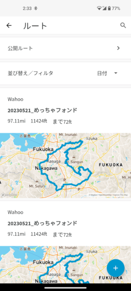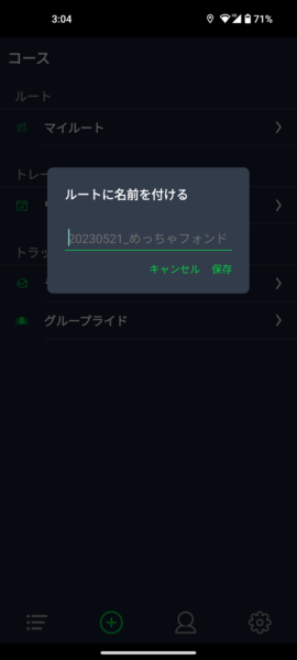 確認後、アプリ下部プラスマークを押して「マイルート」を選択、すると名前を付けたファイルが一番上に表示されます。