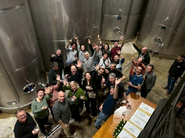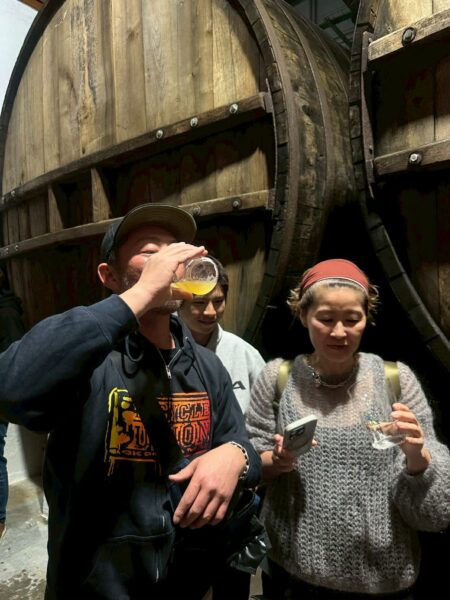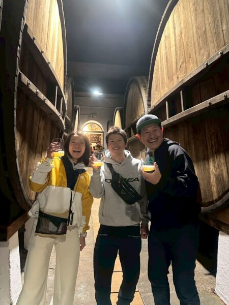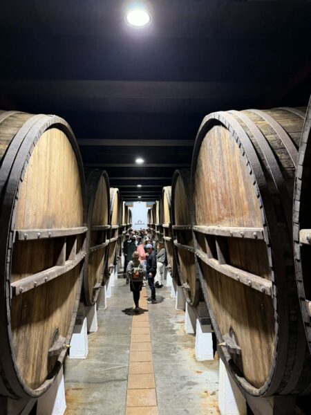 巨大な樽がズラリと並ぶ貯蔵室で、樽から直接グラスに注いで回し飲みするという、