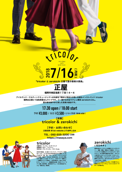 2009年結成の3人組インストバンド。ケルト、特にアイルランド音楽をベースに、3人それぞれの色を混ぜながら演奏している。これまでに「朝」「旅」「うた」などをテーマにしたCDを6作発表。最新作は総勢13名のメンバーで製作された「tricolor BIGBAND」(P-VINE, Inc.)。